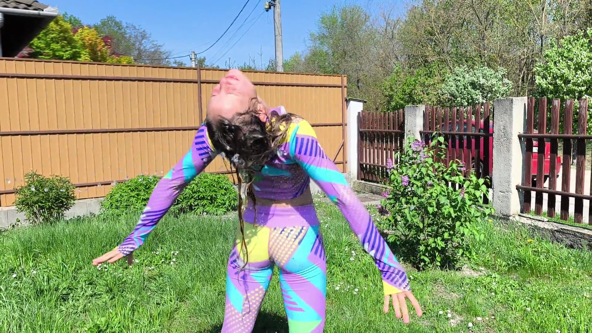 Lisa takes her first outdoor wetlook session into the garden, wearing a bright purple, turquoise, and yellow sporty outfit that stands out immediately in the sunshine. The video starts with hose soaking on the grass, letting the water run over the colorful top, leggings, socks, and sneakers.