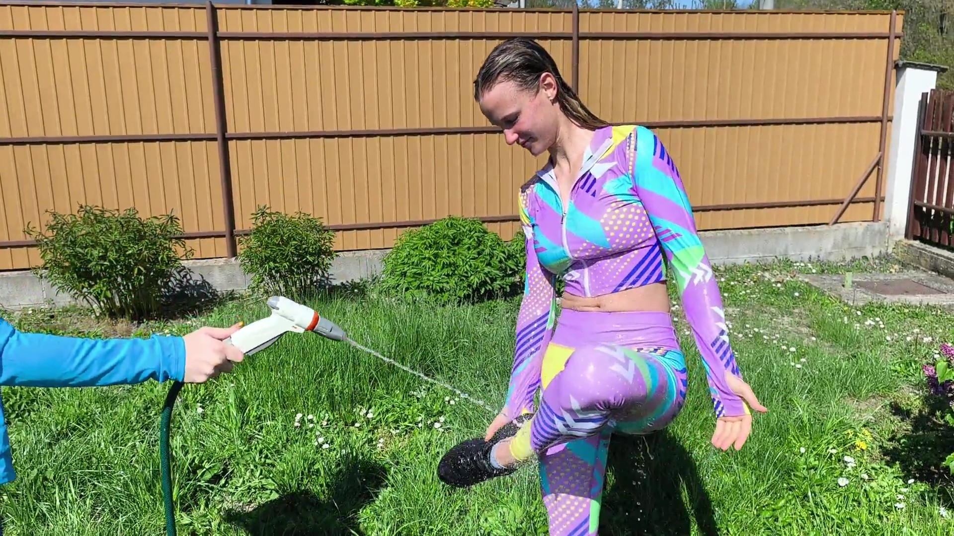 As the outfit gets wetter, the fabric turns glossy and clings more tightly, while the bright colors stay strong against the green garden background. Lisa moves through the grass, gets sprayed from different angles, soaks her hair, and finishes with a fully drenched outdoor look in the sun.
