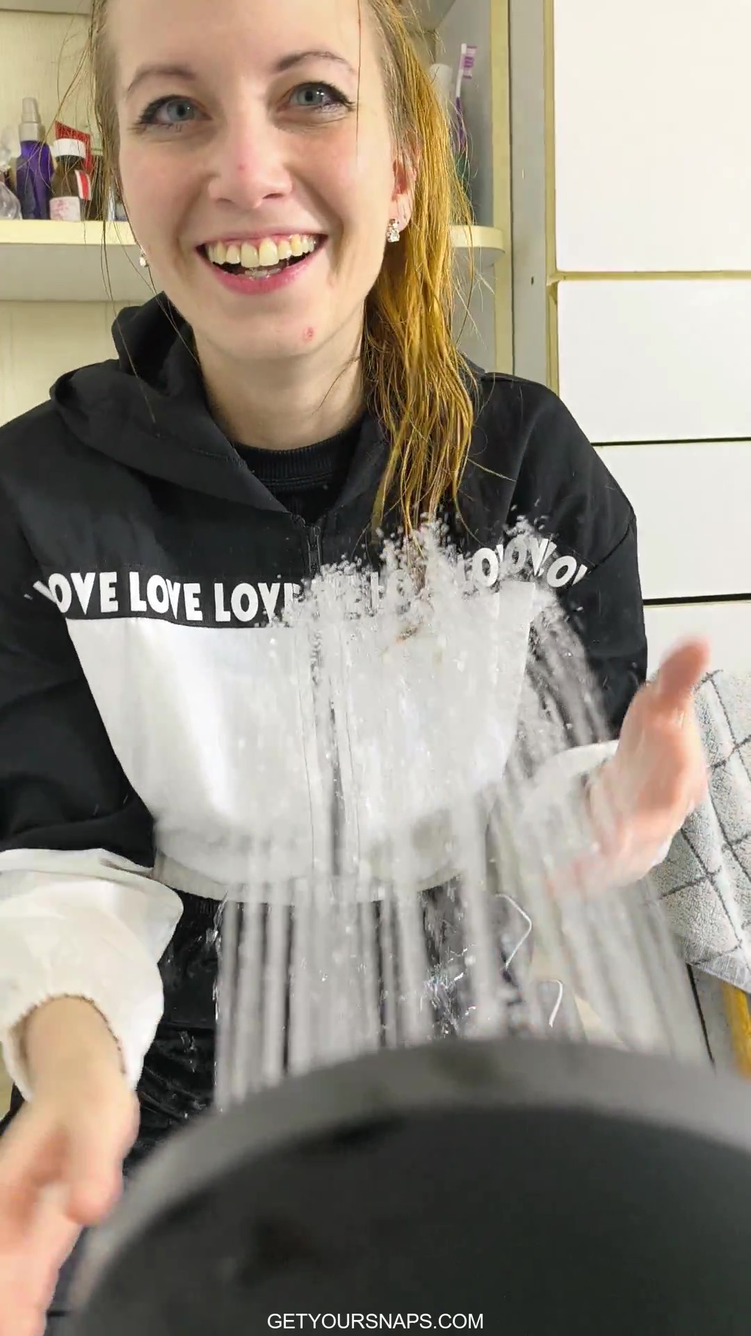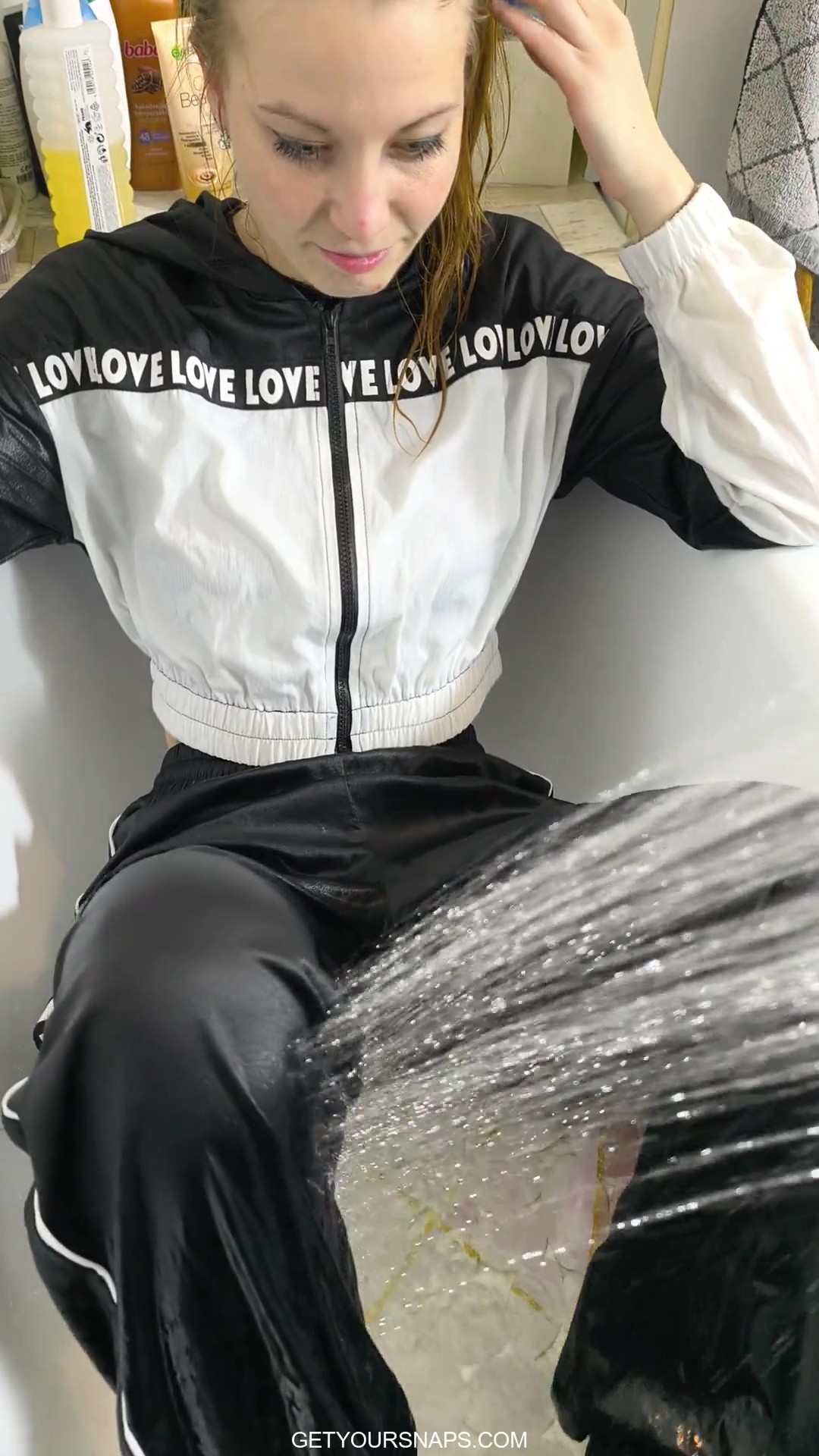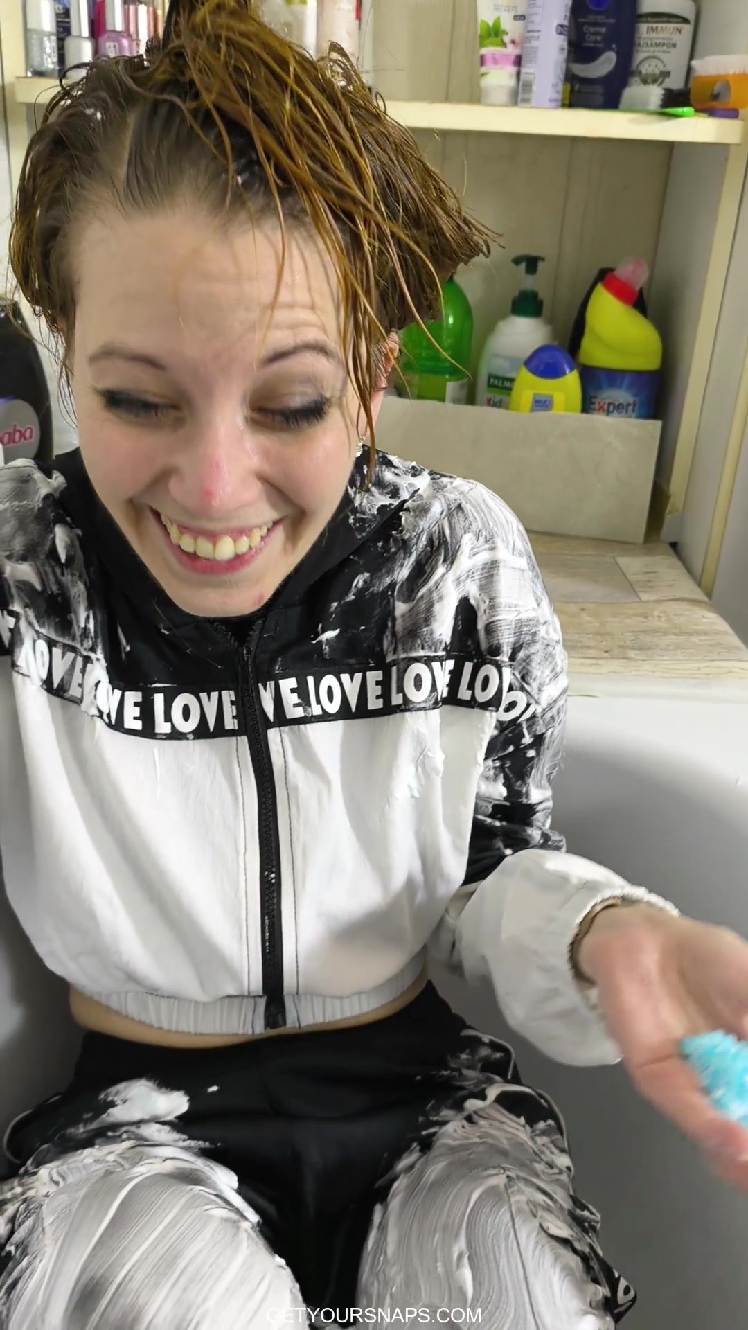 This video is filmed entirely from a first-person point of view during a shared bath with Sarah, placing you directly in the scene from start to finish. The camera stays close as you gently wash her hair, work shampoo into foam, and rinse it away with running water. Sarah joins in naturally, covering herself with foam, playfully spreading some onto you as well, then washing it off from both of you. The focus remains on hands, water flow, wet fabric, foam, and small details, with everything gradually becoming soaked and slippery. The mood is relaxed and playful, built through simple, natural actions rather than posing, while the vertical framing keeps the experience intimate and personal throughout.