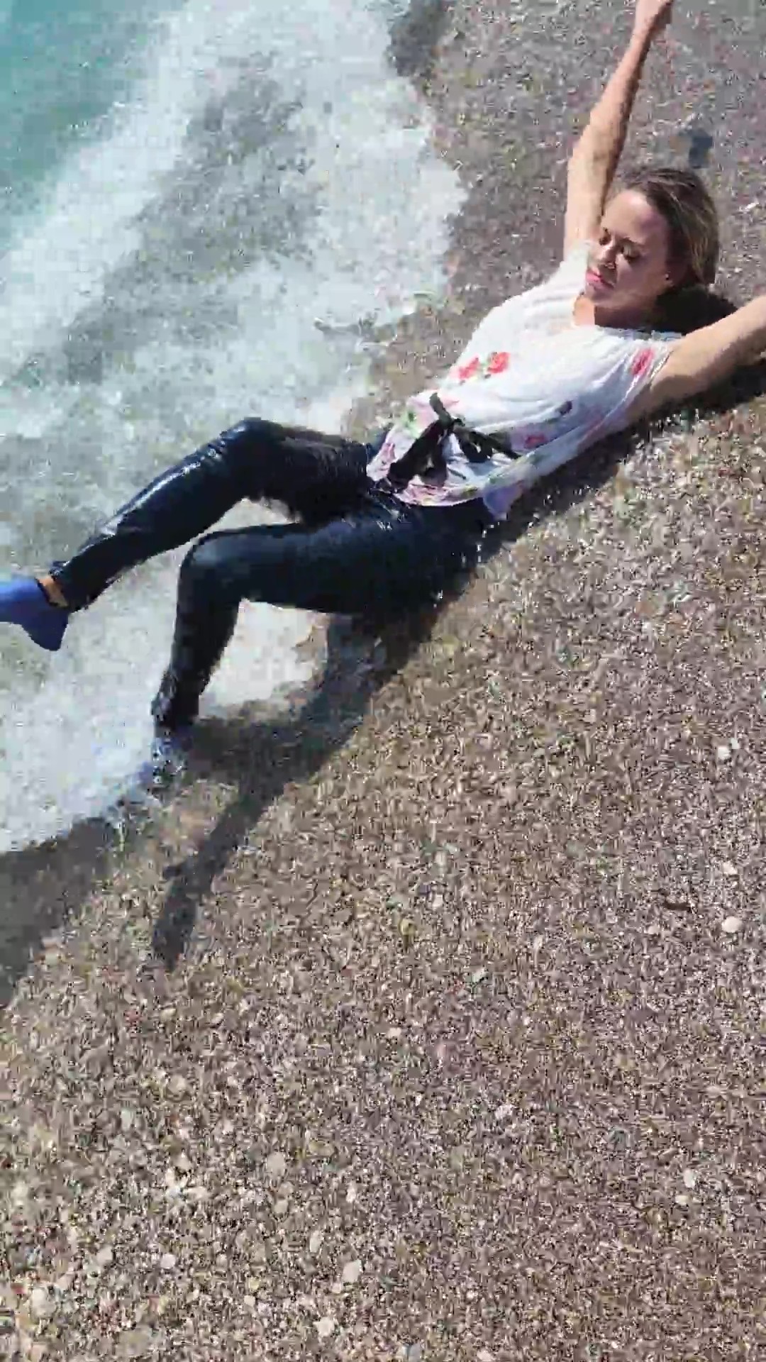 Sometimes the best moments happen spontaneously — like when Bella, while walking by the seaside, decided to take a fully clothed dip in the ocean. With Gina behind the camera, she didn’t hesitate for a second — stepping straight into the waves, laughing as the water soaked her loose top and her tight jeans began to cling to her legs and hips.