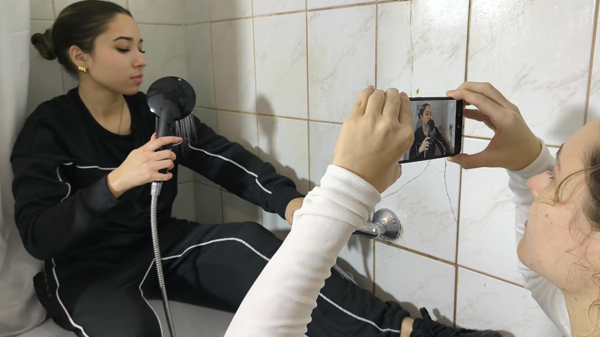 In this new wetlook episode, Violet is already completely soaked when Ellie steps into the bathtub with her. This time, Ellie brings a phone too, so the girls can film each other up close while their clothes get heavier and wetter with every moment.