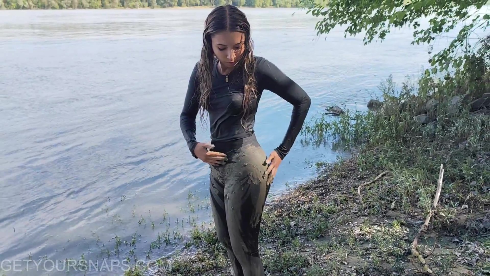 Ellie steps into the river wearing grey long sleeves, sporty leggings, and sneakers. As the water slowly soaks her outfit, she spots a muddy patch nearby and playfully covers her leggings in thick mud — just to rinse it all off again in the water. A lighthearted mix of wetlook and muddy fun in one 13:37 min FHD video.