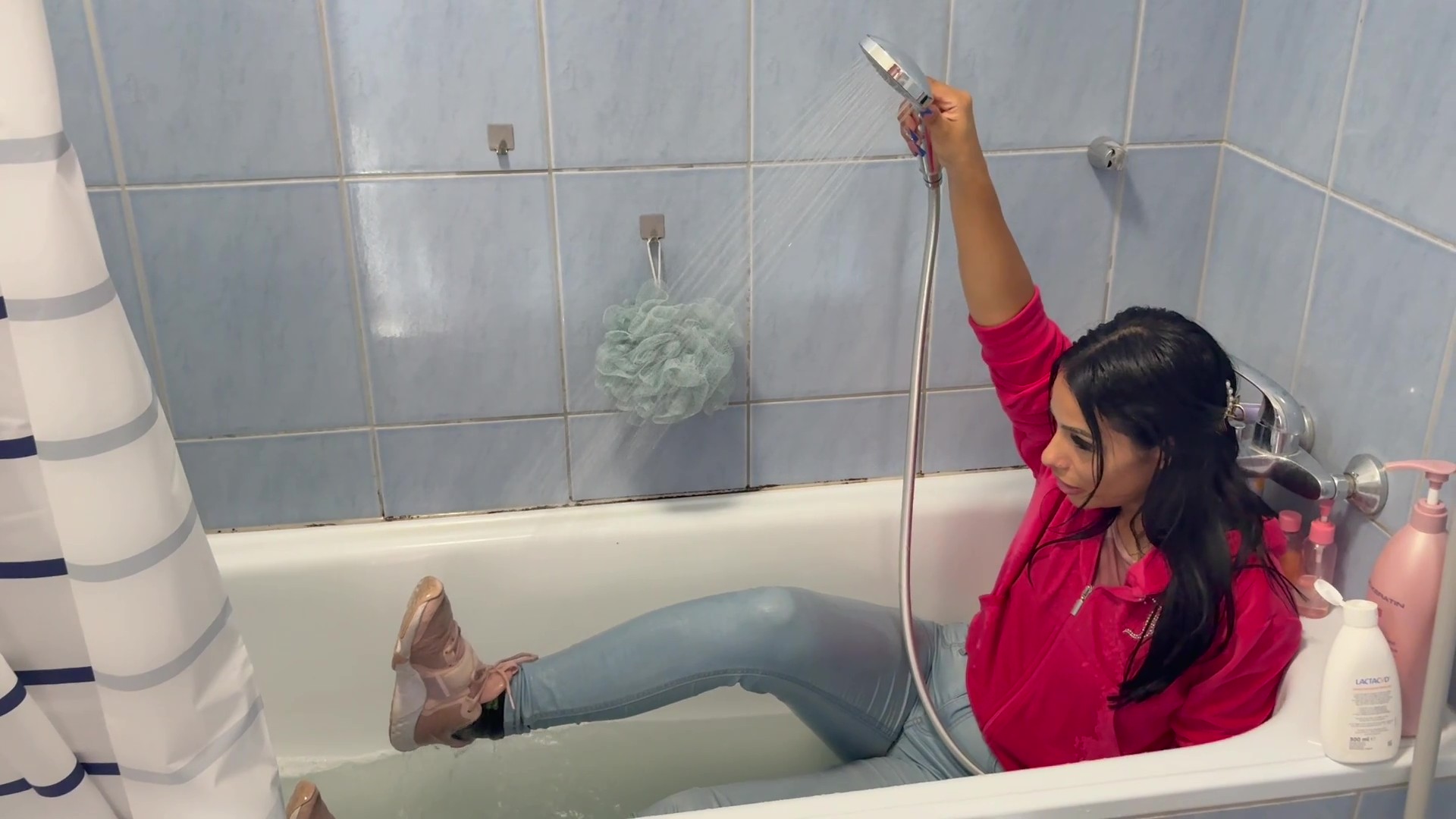 The scene feels natural and spontaneous, focusing on the visual pleasure of wet fabric, clinging denim, and Gina’s relaxed, confident presence. Sometimes she stands in the tub using the shower head, sometimes she sits back and enjoys the water, smiling and playing with the stream as her outfit becomes completely soaked.