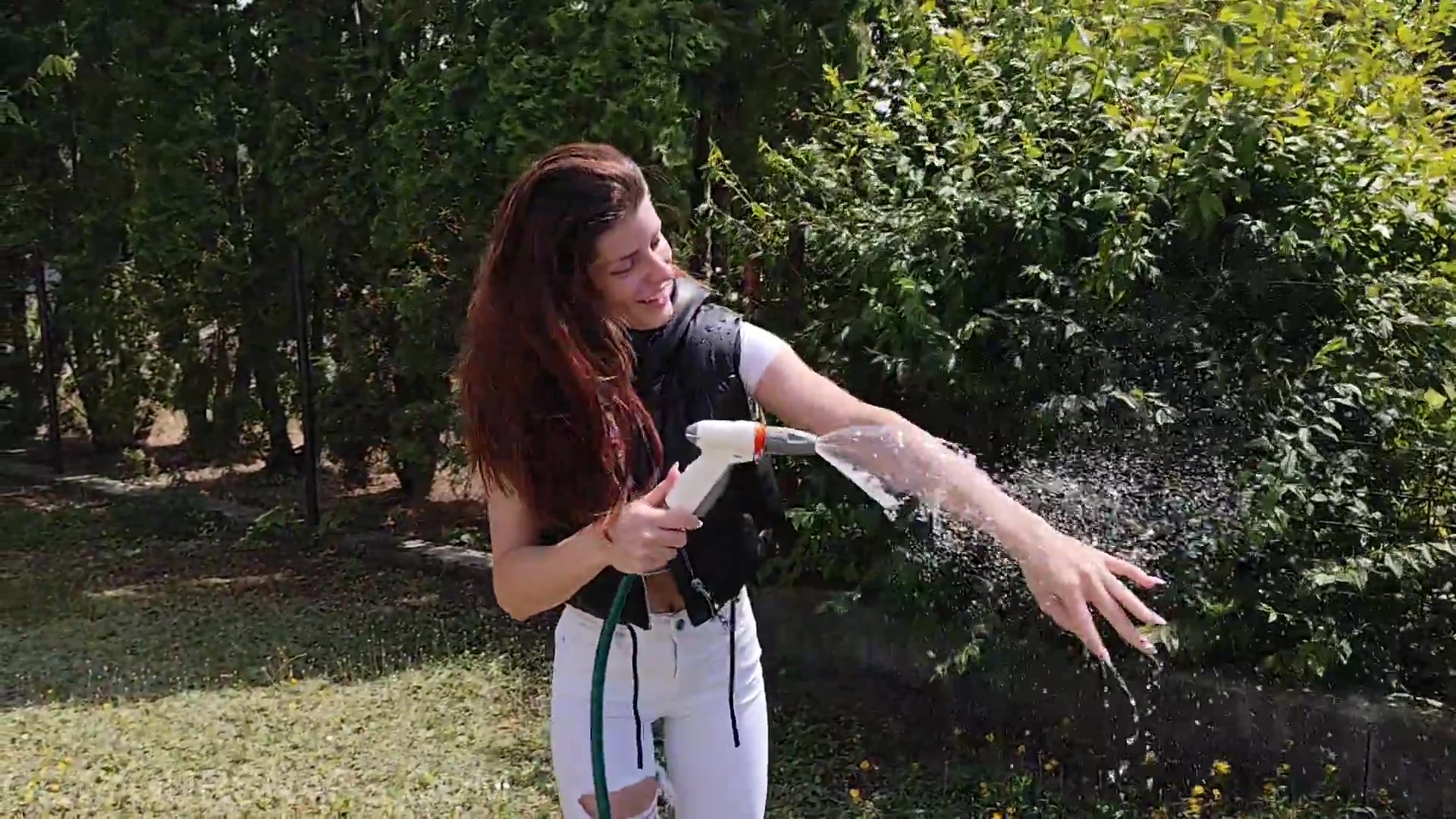 Jazmin plays with the hose