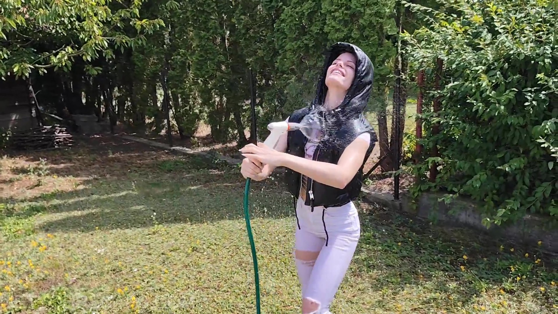 Jazmin takes on a breezy, slightly chilly day in pure wetlook style! Dressed in white pants, sneakers, a sheer white top, and a black vest, she grabs the garden hose and soaks herself from head to toe. As the water runs and the grass gets wetter, off comes the vest and even the shoes — because running barefoot through wet grass feels amazing. Once she’s fully in the mood, she hands over the hose and strikes some jaw-dropping poses while getting drenched all over again.