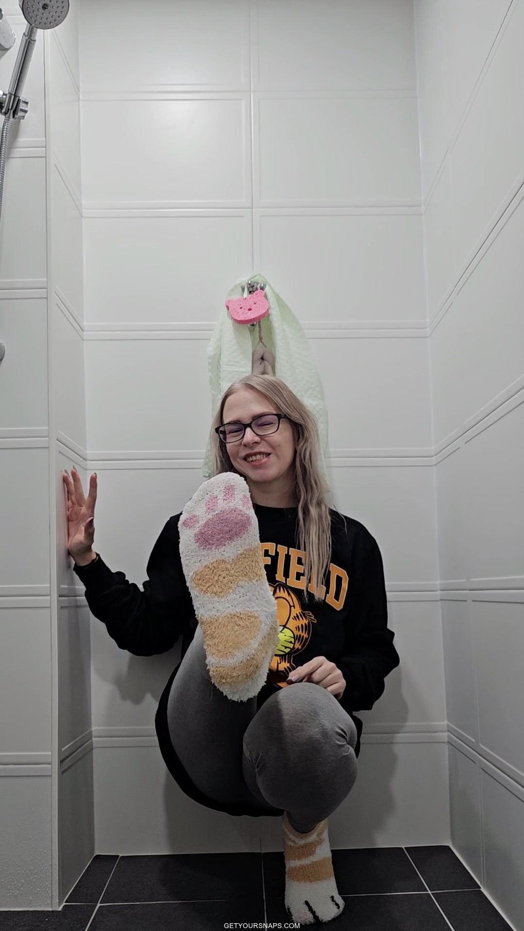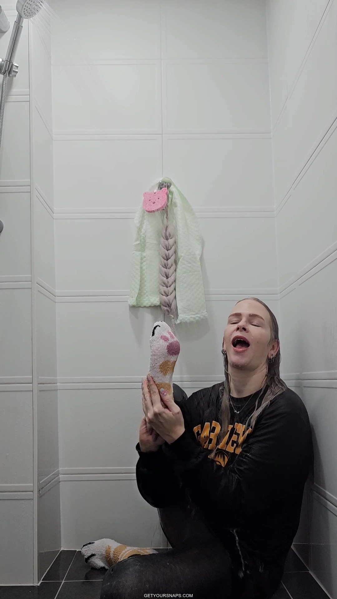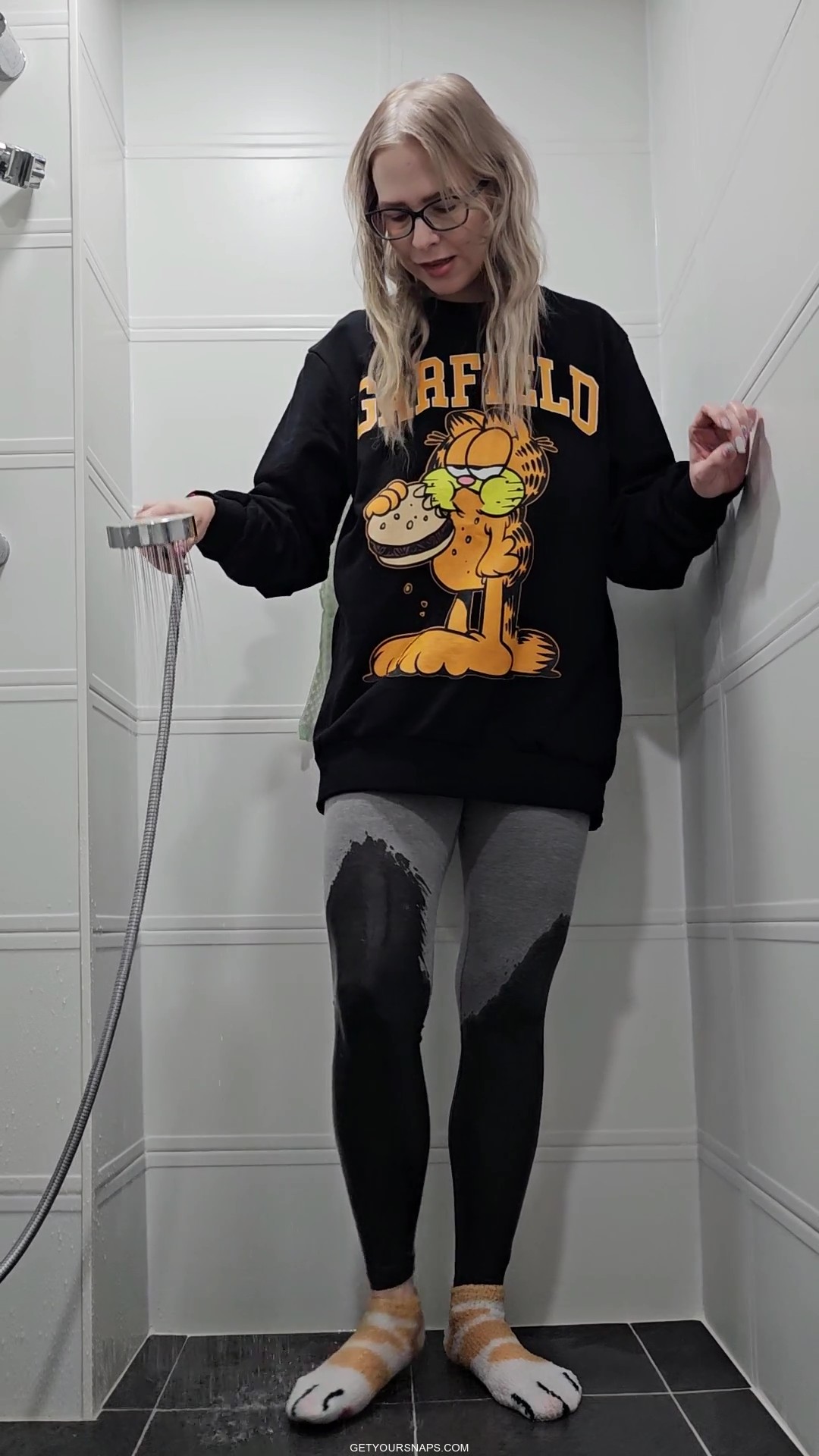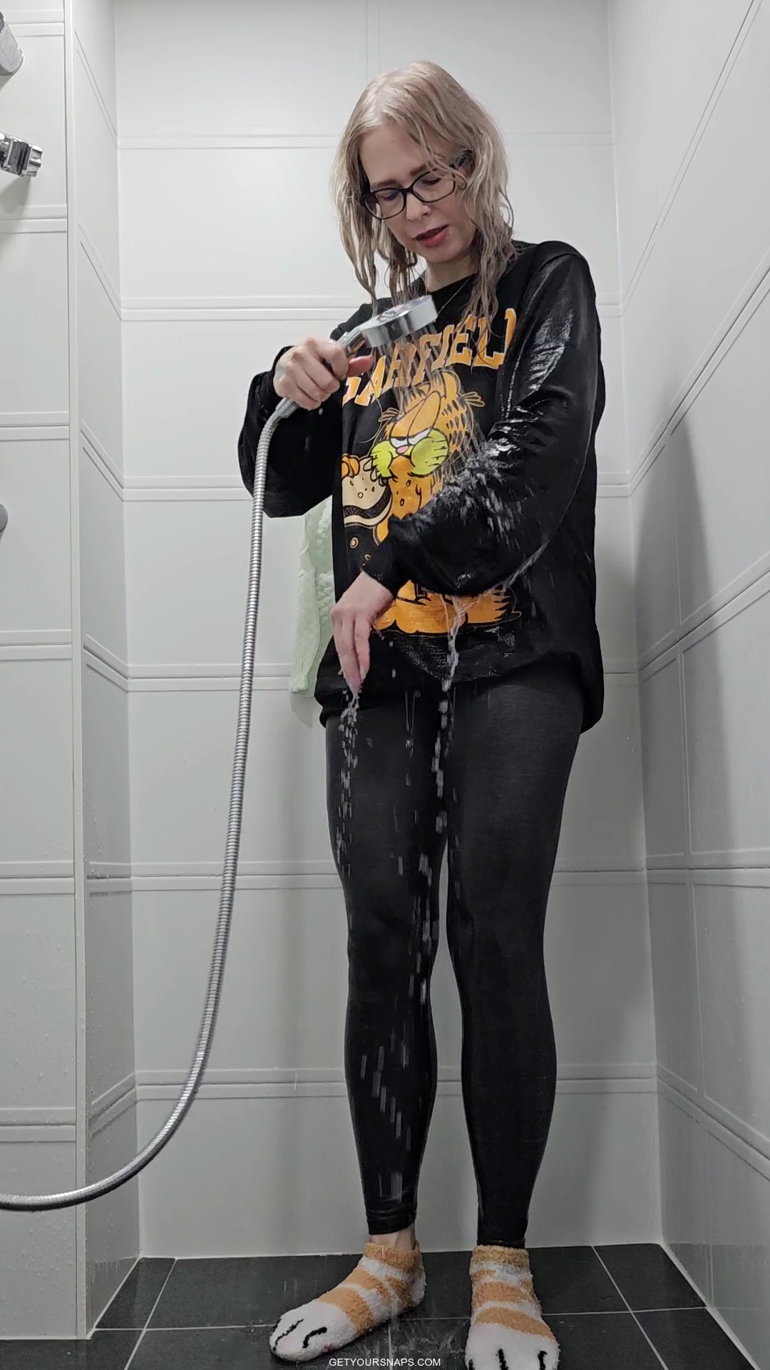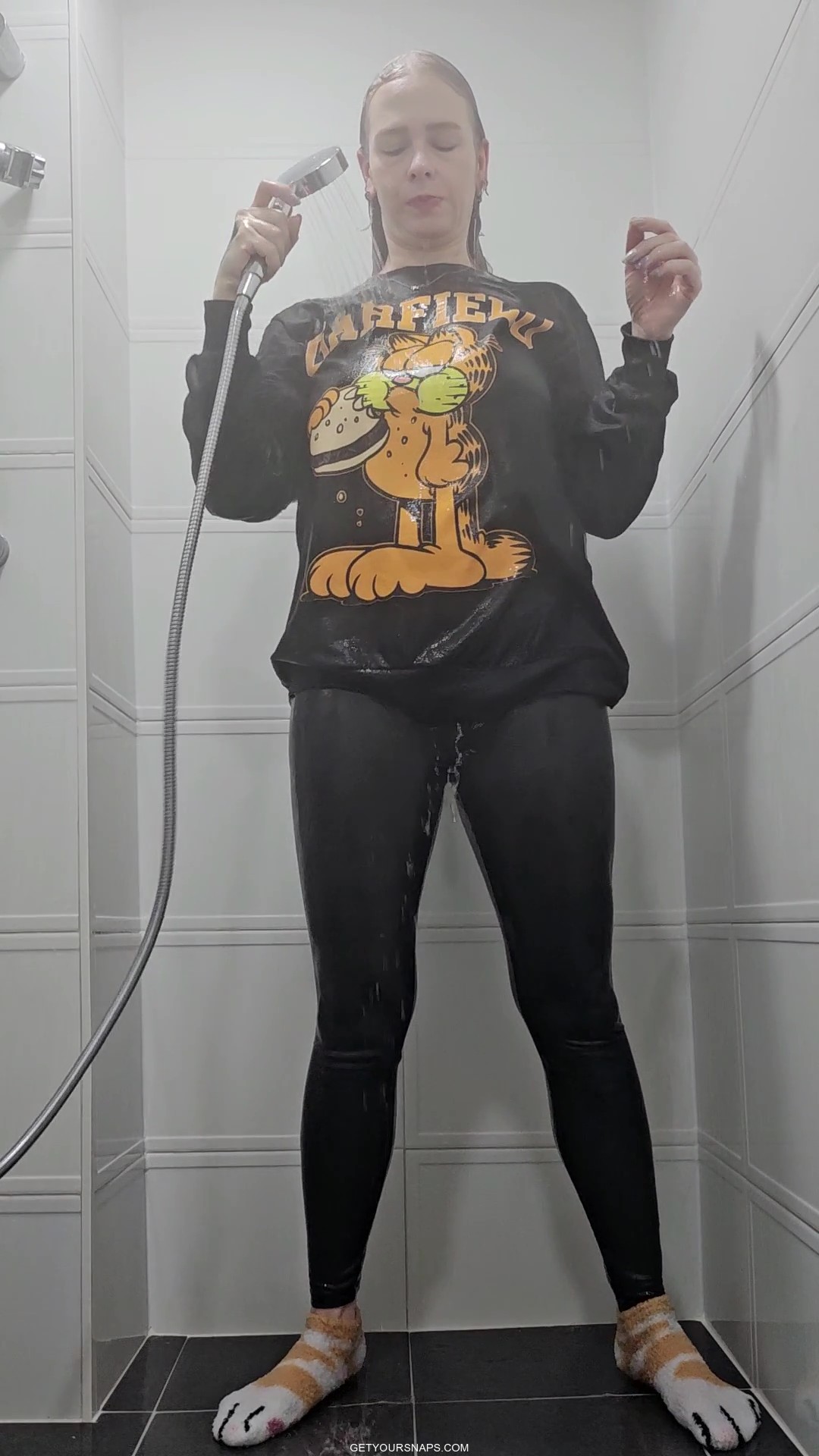 Rain takes a playful shower fully dressed in a black Garfield hoodie, soft cat-paw socks, and tight leggings. She slowly soaks each piece of clothing with the handheld shower head, letting the water run down the fluffy cartoon sweater and into her leggings until everything is drenched.