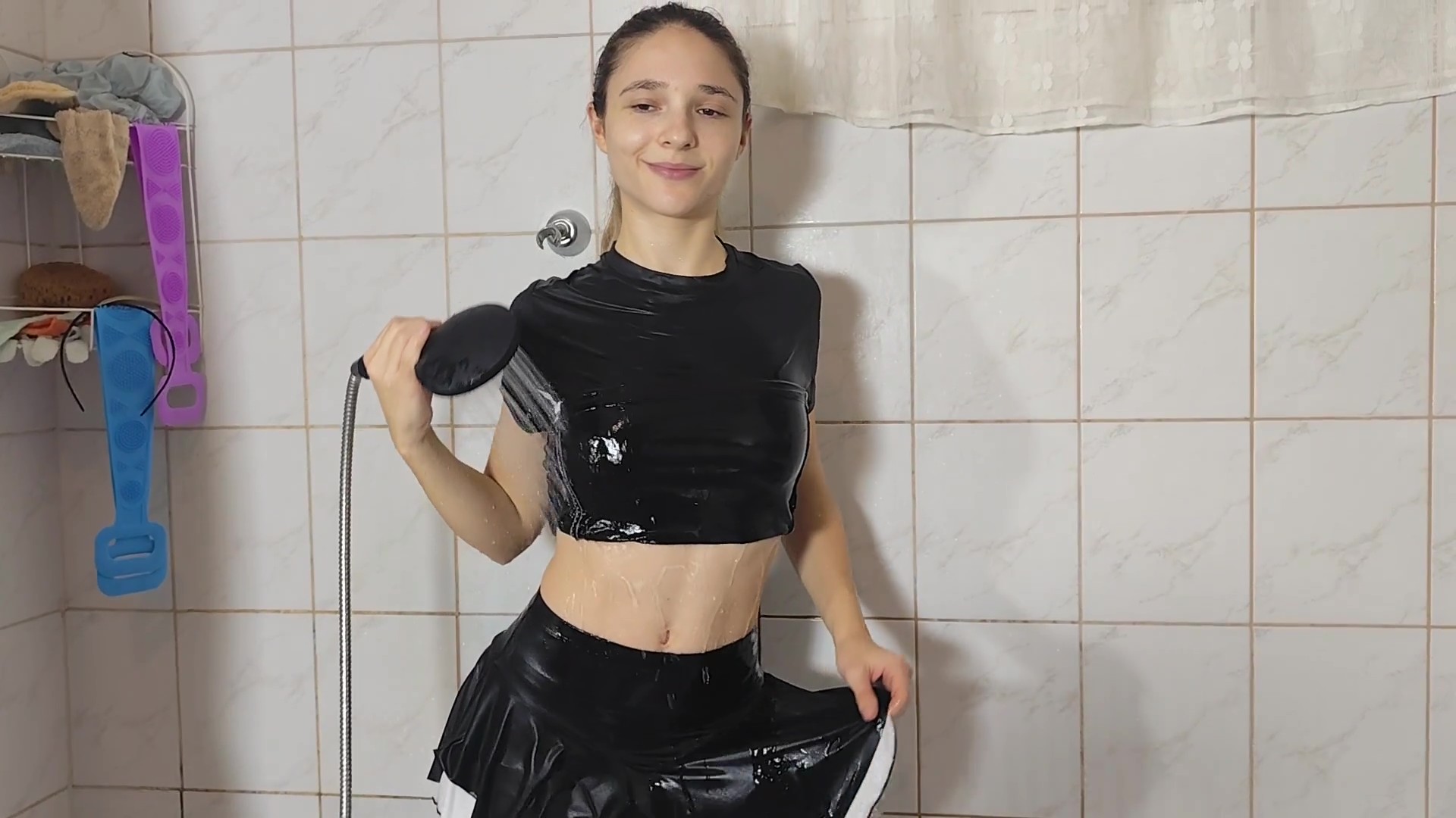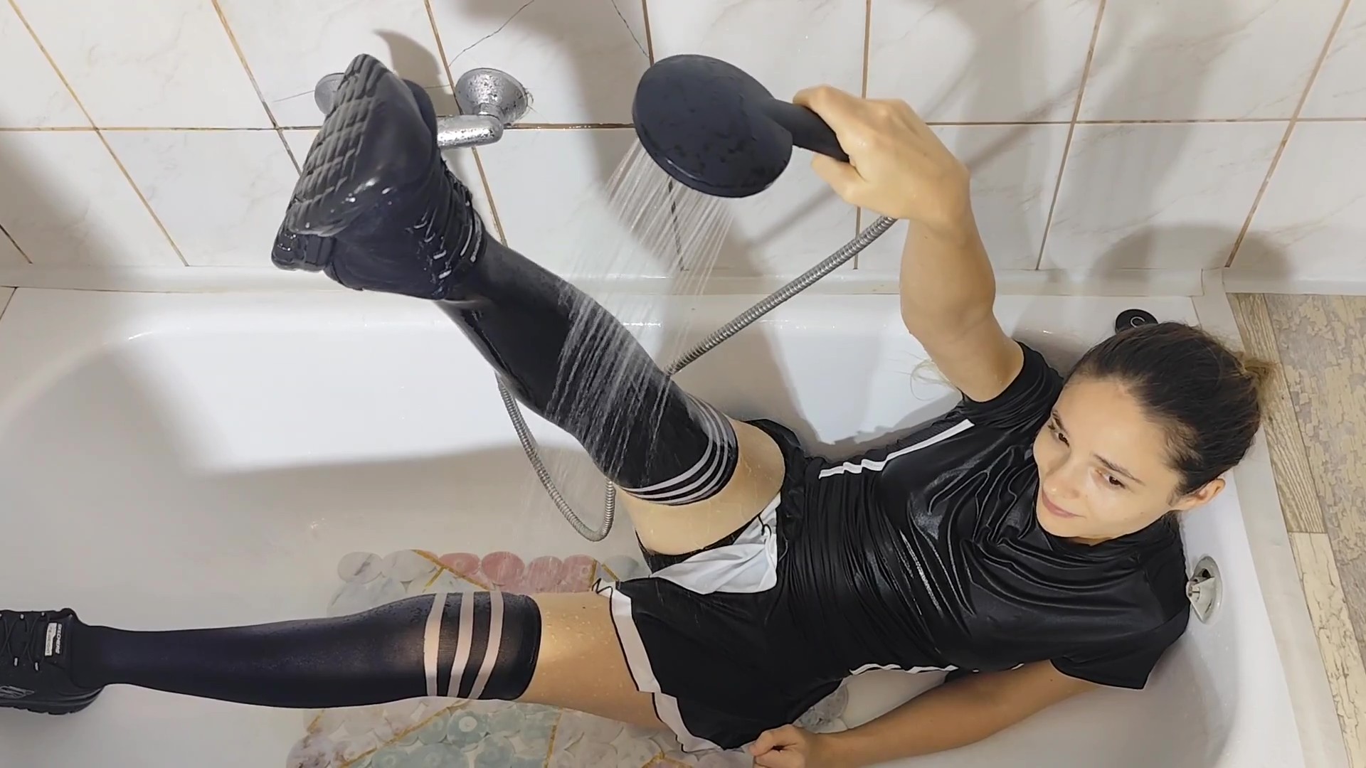 Violet is back in the bathtub, this time in a playful tennis outfit. What starts as lighthearted fun quickly turns into a fully soaked experience as water runs over her clothes, clinging to every move. She relaxes, stretches, splashes, and enjoys the moment, letting the outfit get completely wet while teasing the camera with smiles and poses.