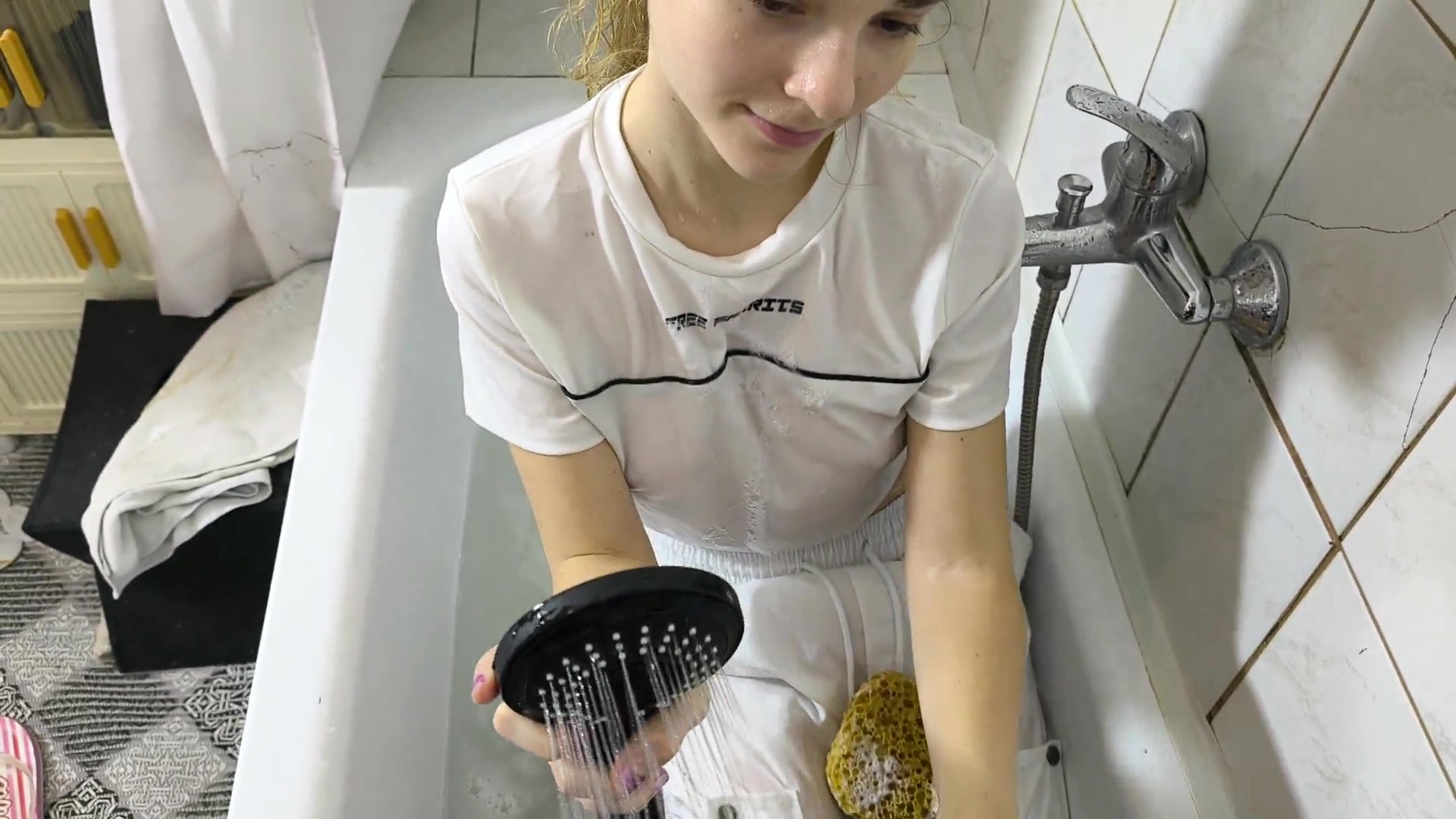 Jazmin takes a shower in Gina’s tub